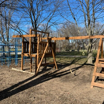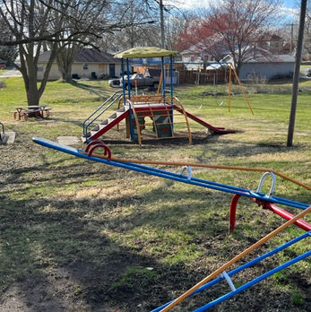 Playground equipment includes: swings, merry-go-round, slide, teeter-totter, climbing center